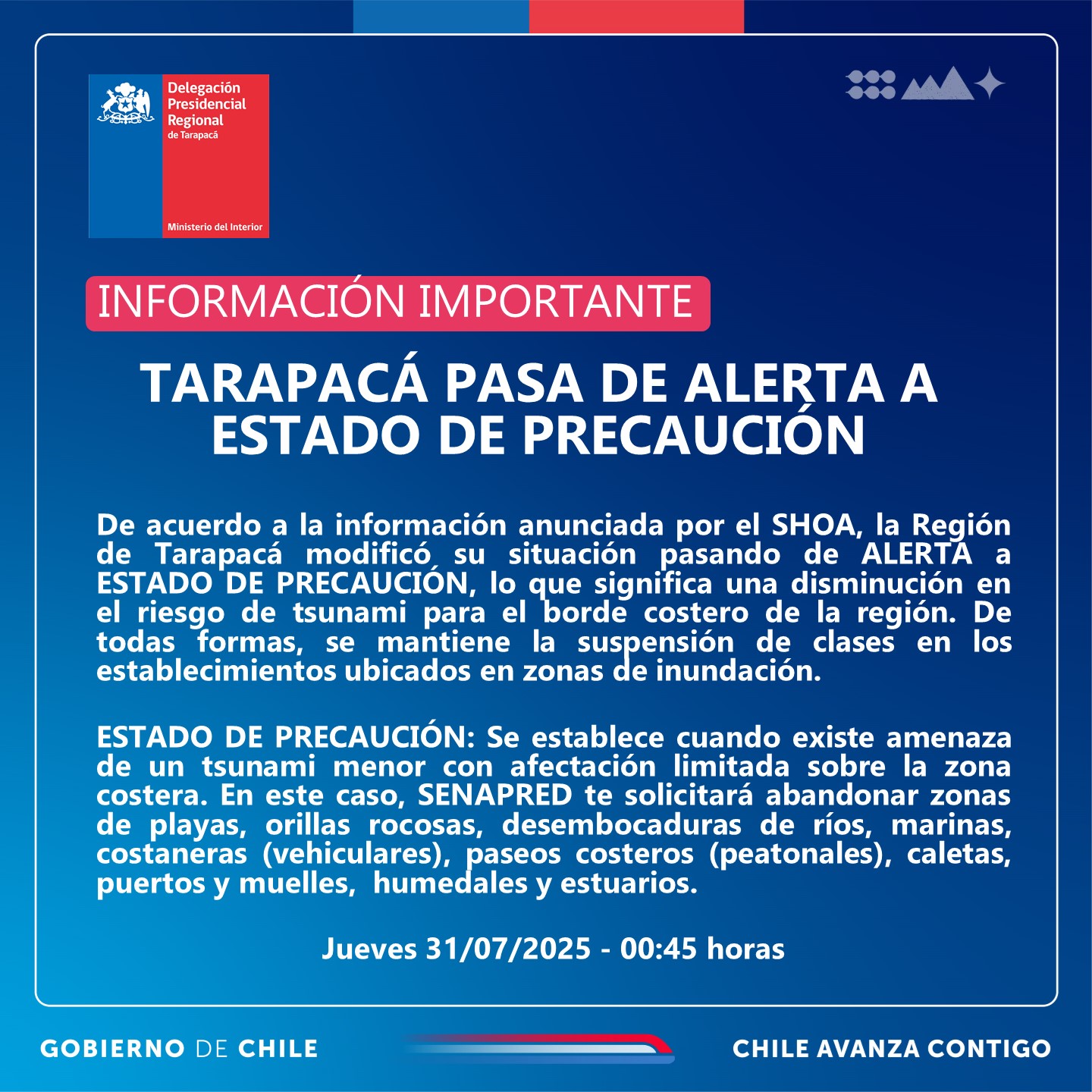 El Servicio Nacional de Prevención y Respuesta ante Desastres (Senapred), en conjunto con el SHOA y la Delegación Presidencial de Tarapacá, informa que la comuna de Iquique ha pasado de estado de alerta a estado de precaución ante la amenaza de tsunami generada por el terremoto de magnitud 8.8 ocurrido en Rusia.