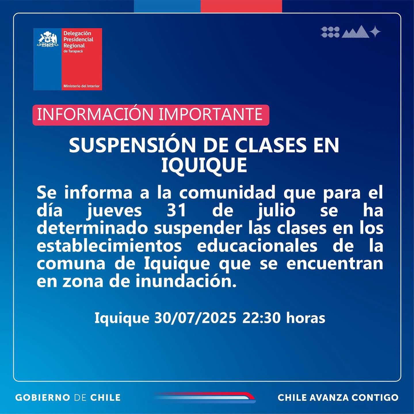 El Servicio Local de Educación Pública (SLEP) Iquique, en coordinación con el Ministerio de Educación y Senapred, informa que se mantiene la suspensión de clases para el jueves 31 de julio de 2025 exclusivamente en sectores de la comuna que han sido definidos como zonas de evacuación conforme a la alerta de tsunami vigente.