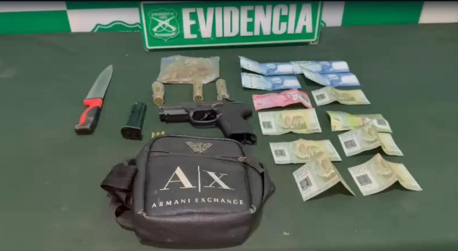La droga incautada y las demás especies fueron remitidas a Labocar para su peritaje, mientras que el sujeto fue detenido por infracciones a la Ley de Control de Armas y por posesión de droga.